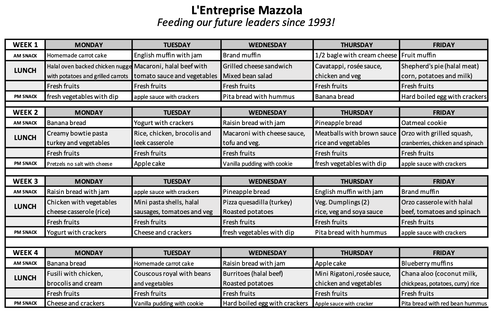 Children are provided with a hot lunch and three snacks daily, catered by Mazzola Kitchen. Mazzola’s specialty is preparing and distributing healthy and fresh meals to elementary and secondary school students and daycares in the National Capital region. Mazzola creates meals from fresh ingredients without additives, preservatives or artificial flavours. They have over twenty years of experience in preparing healthy and tasty food.